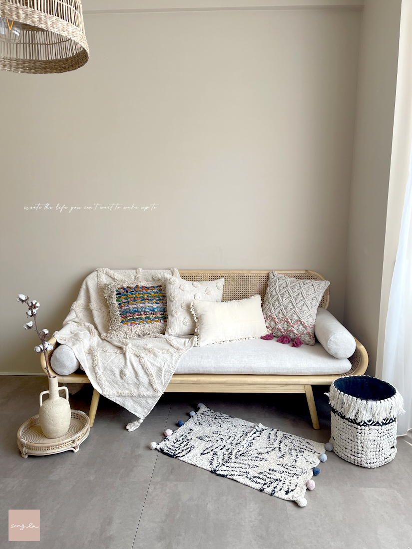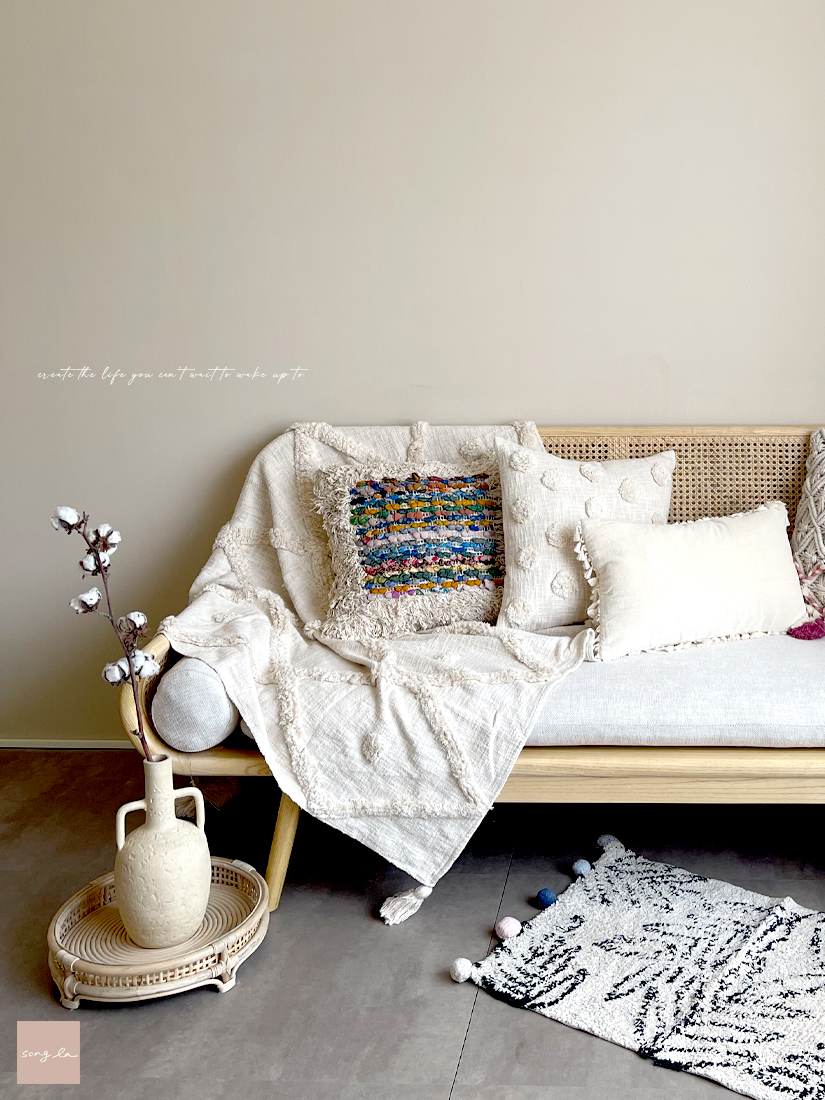 印度進口純手工簇絨菱格與毛球裝飾蓋毯
