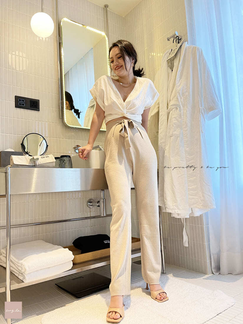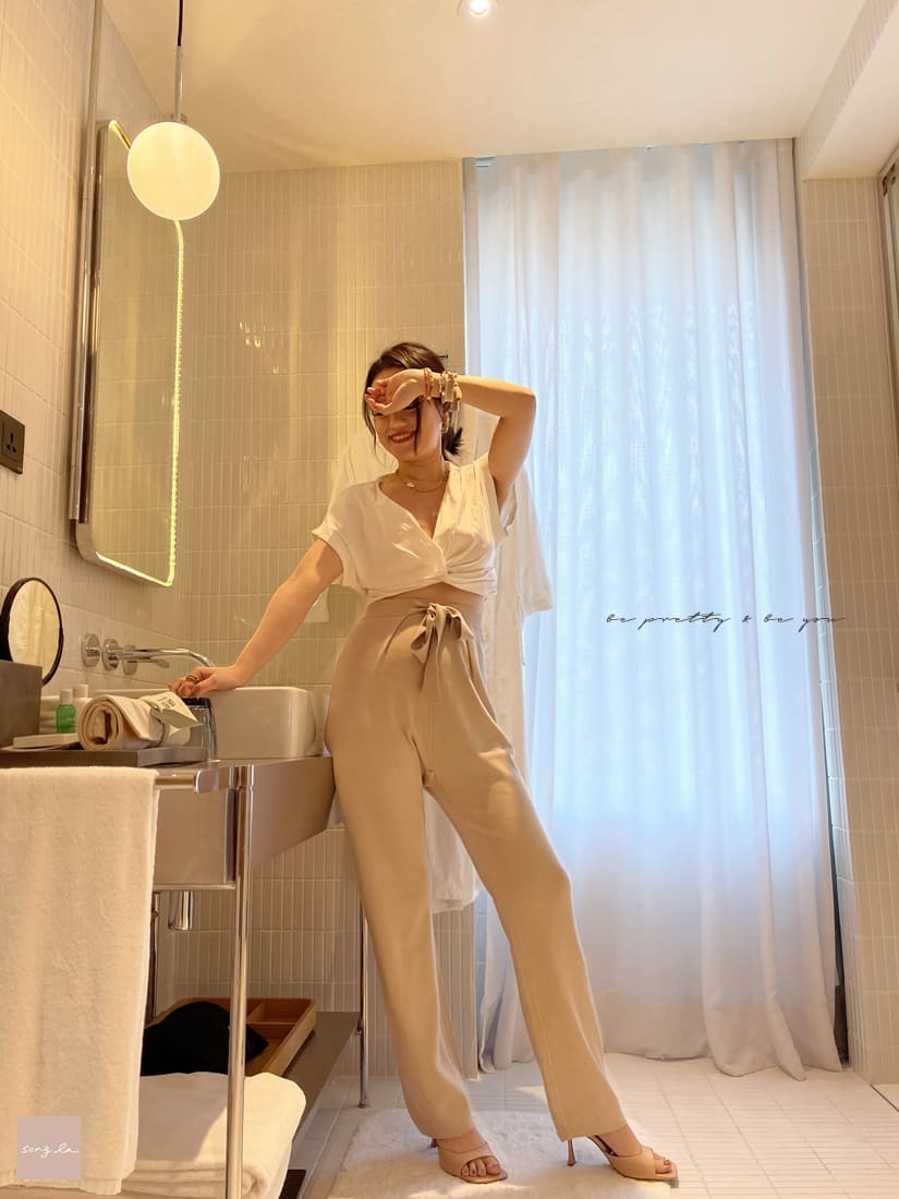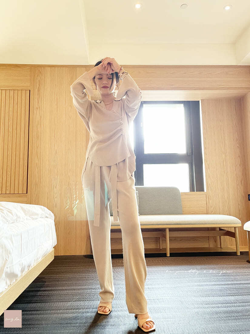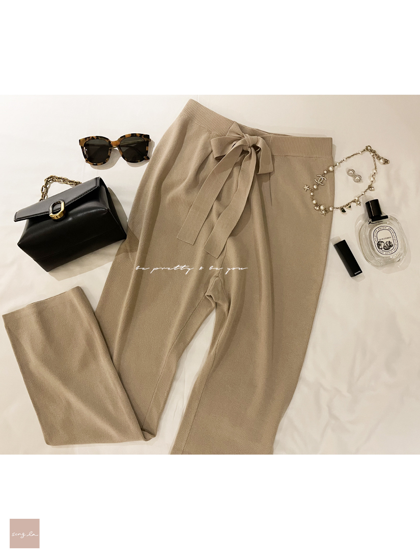 設計細節: 腰打摺/腰頭綁帶/褲管直筒設計