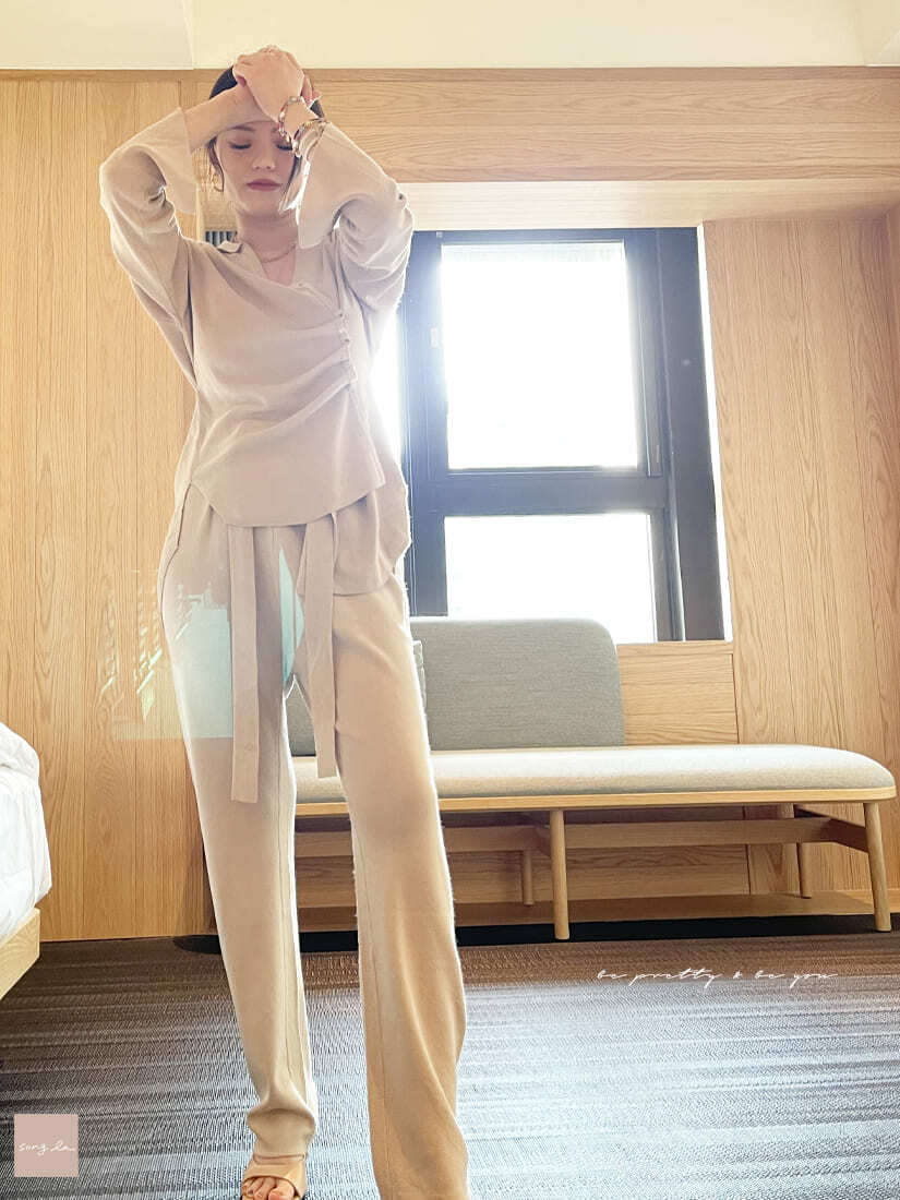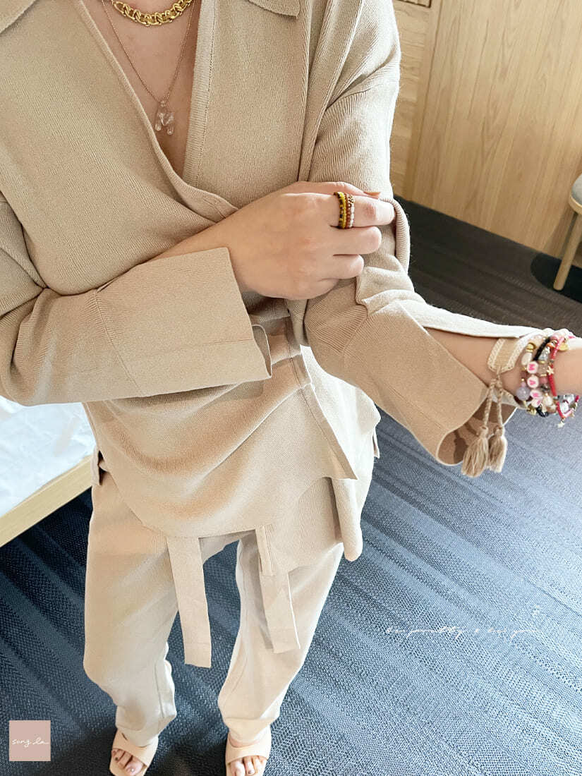 設計細節: 襯衫領/V領設計/腰綁繩/可斜穿不對稱設計